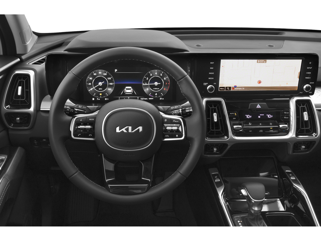 The Sorento SX's striking exterior is complemented by a meticulously crafted interior that showcases Kia's commitment to premium materials and attention to detail. Sink into the heated, 8-way power-adjustable front seats and enjoy the convenience of the Smart Key with push-button start and remote start. The expansive panoramic sunroof and advanced infotainment system with navigation further elevate the driving experience.